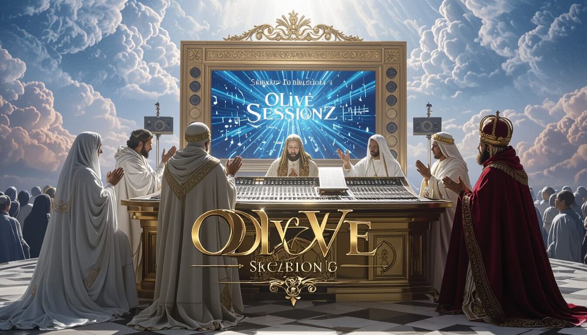 This image depicts holy figures worshipping around a grand music studio, viewed from a producer's perspective. It features a throne, vibrant colors, and dramatic lighting in a highly detailed digital matte painting style.