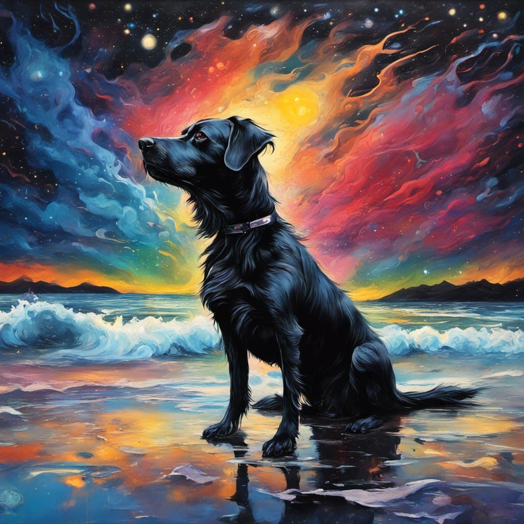 A vibrant graffiti art image of a black dog under a starry night sky near a beach. The artwork features high contrast, colorful splashes, and ultra-detailed textures.