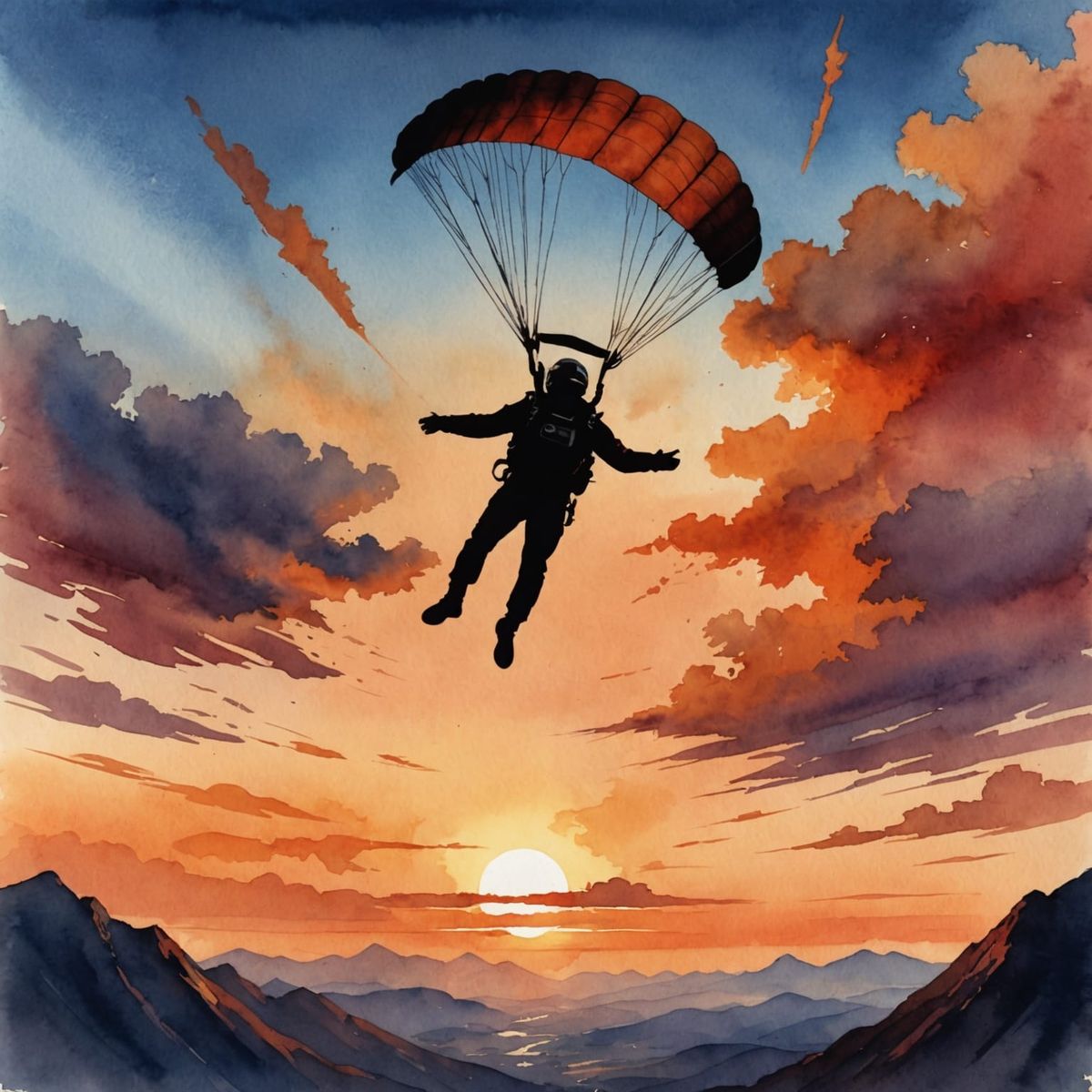 A striking picture of a lone skydiver silhouetted against a vibrant twilight sky. The watercolor illustration captures the serene yet energetic atmosphere, with distant mountains adding depth.