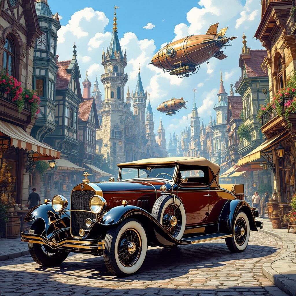 A detailed vintage car with steampunk gears and brass accents on a cobblestone street. Ornate buildings and airships fill the sky in this vibrant fantasy city.