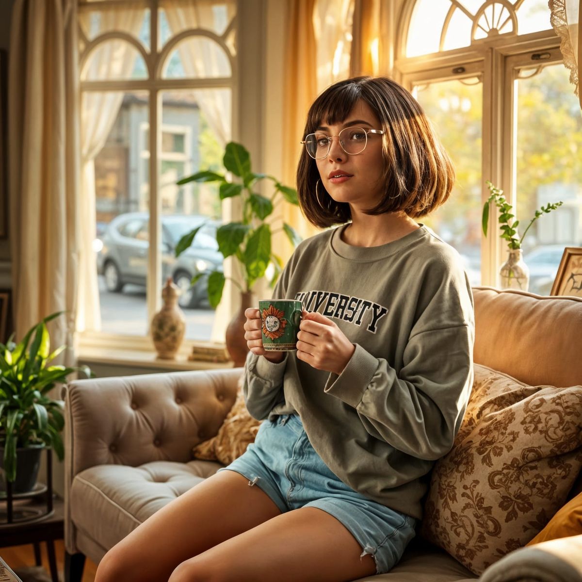 A charming housewife unwinds on a sun-drenched couch, surrounded by antique decor and lush greenery, lost in thought as she sips chamomile tea.