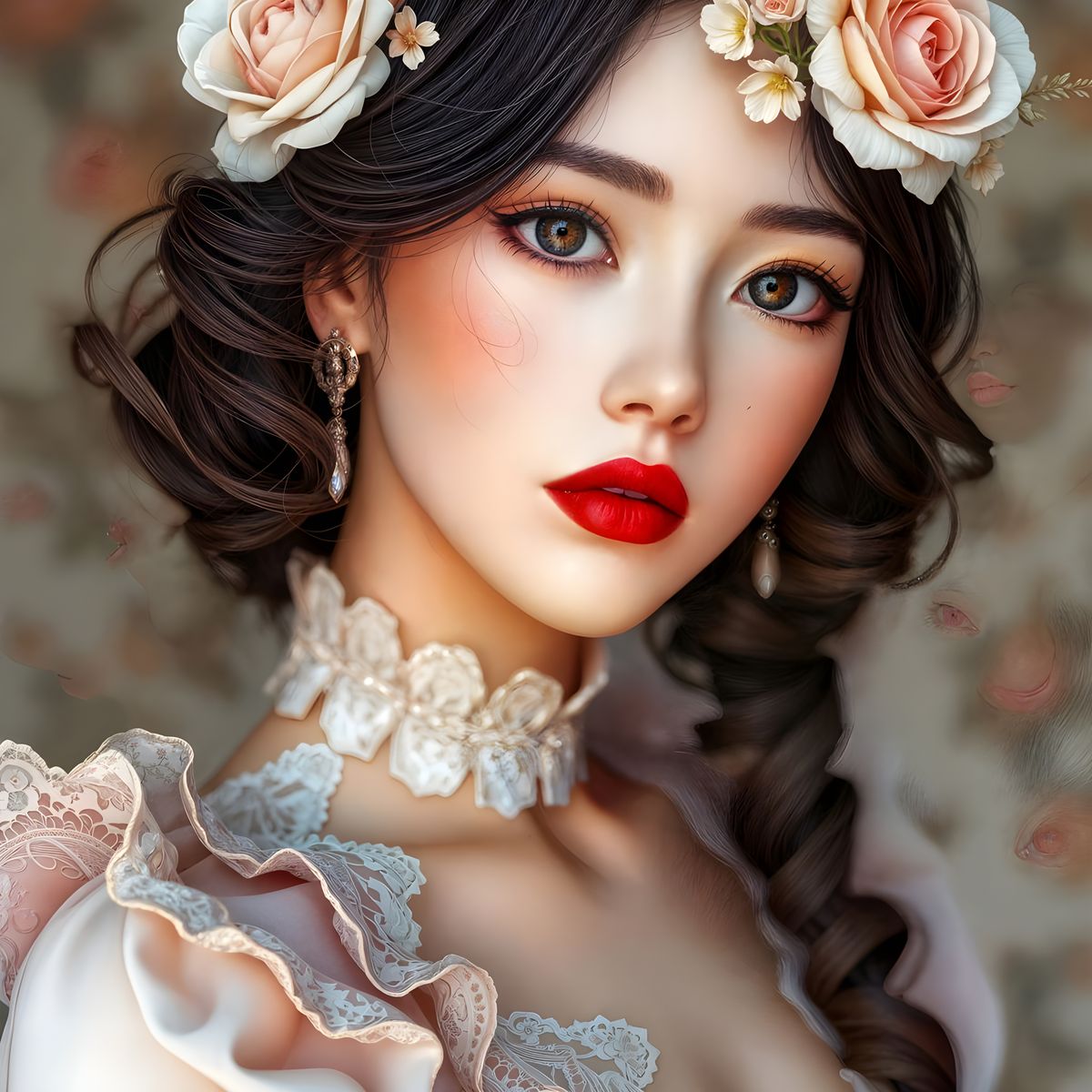 This image shows a beautiful French countryside woman with a stunning pastel-colored outfit and ruby red lips, created in a detailed 3D anime art style with a focus on aesthetic and ultrafine detail.