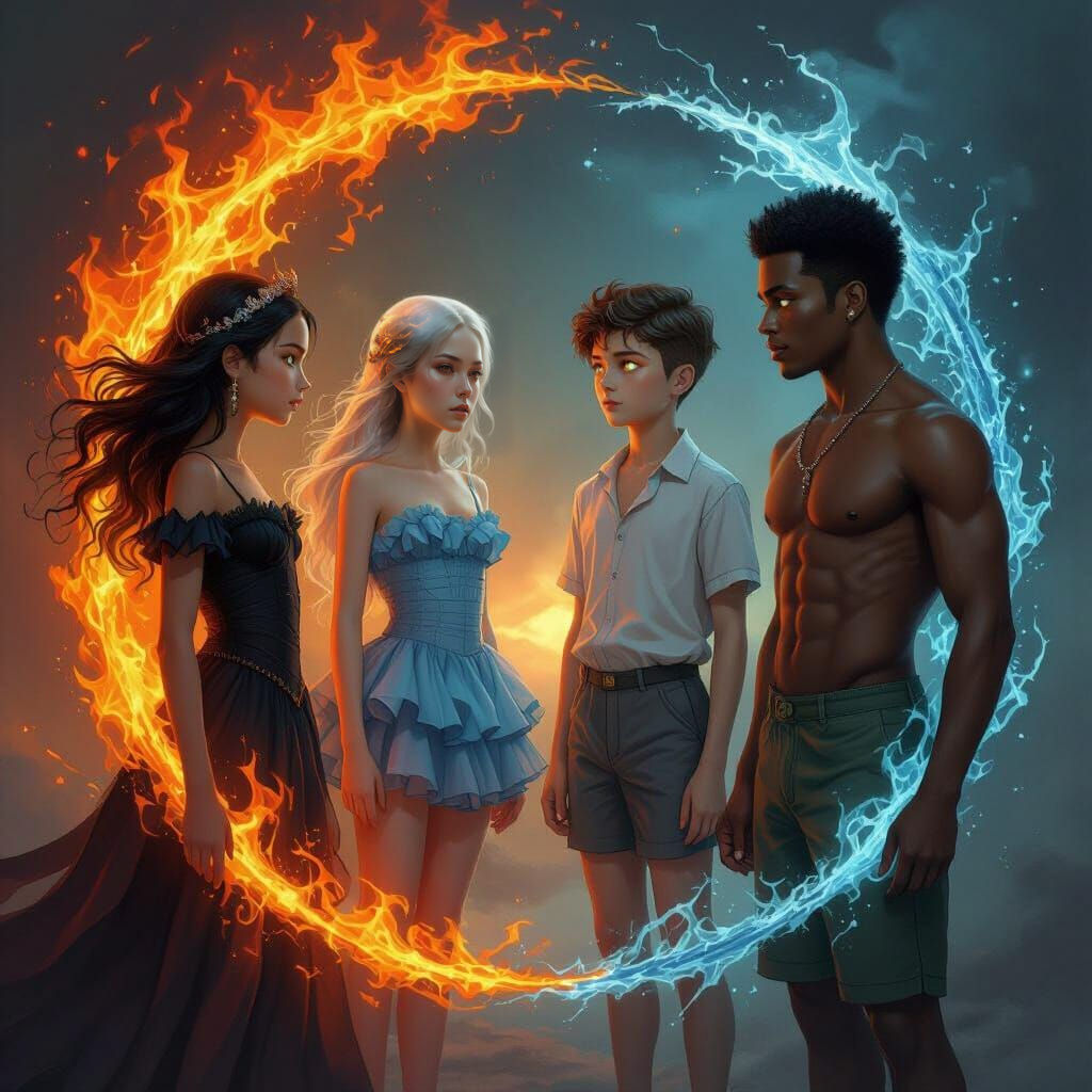 This image depicts four people embodying the elements of fire, water, earth, and air in a dramatic, cinematic scene. Each figure is intricately detailed, representing their element with stunning visual flair.