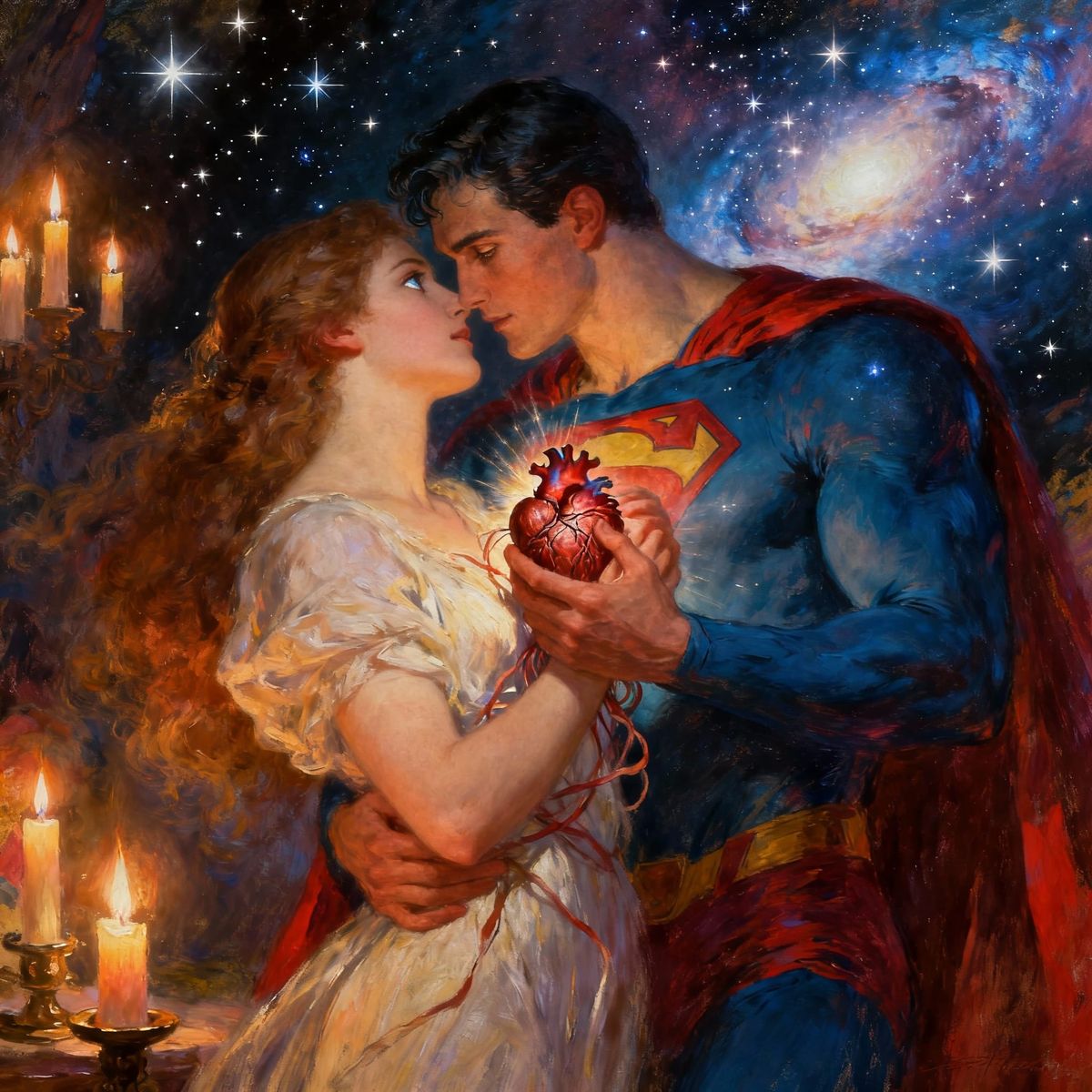 A surreal fusion of myth and pop iconography, this cosmic tableau evokes divine romance and heroic vulnerability. Superman and his muse cradle a human heart wrapped in ribbon, a symbol of love’s raw truth. The galaxy swirls behind them, and candles flicker below. It’s operatic, painterly, and poetic: a celestial vow rendered in superhero flesh and starlight.