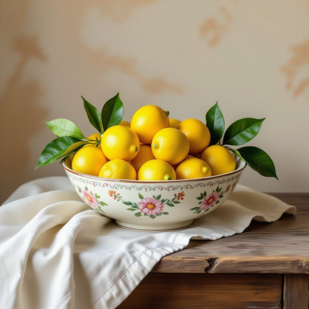 This image shows a ceramic bowl overflowing with lemons and leaves, set on a rustic table with a draped tablecloth. The artwork evokes a warm, inviting atmosphere through its emphasis on texture and pattern.