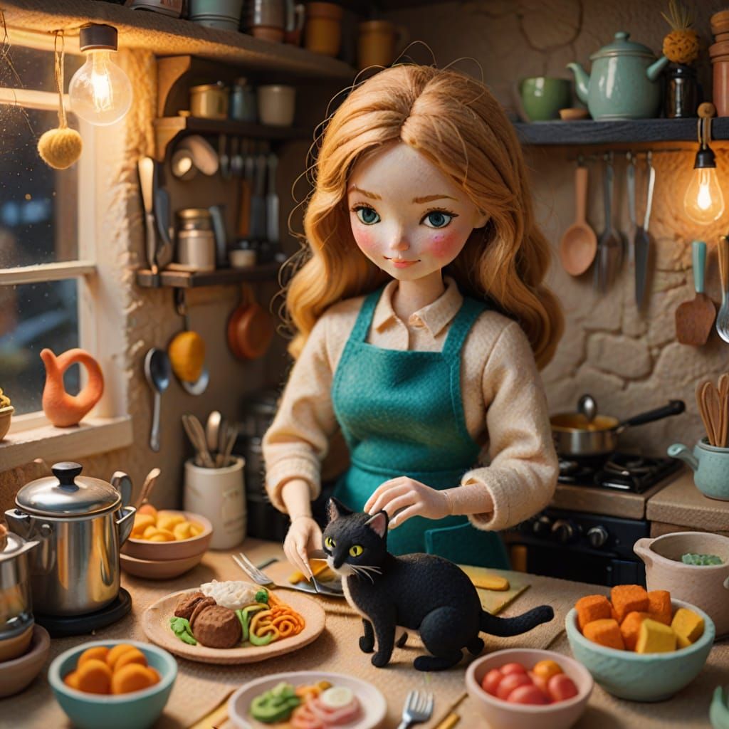 A charming felt art image of a girl cooking dinner while her cat watches. The scene uses soft pastel colors and warm lighting to create an inviting, dollhouse-style miniature.