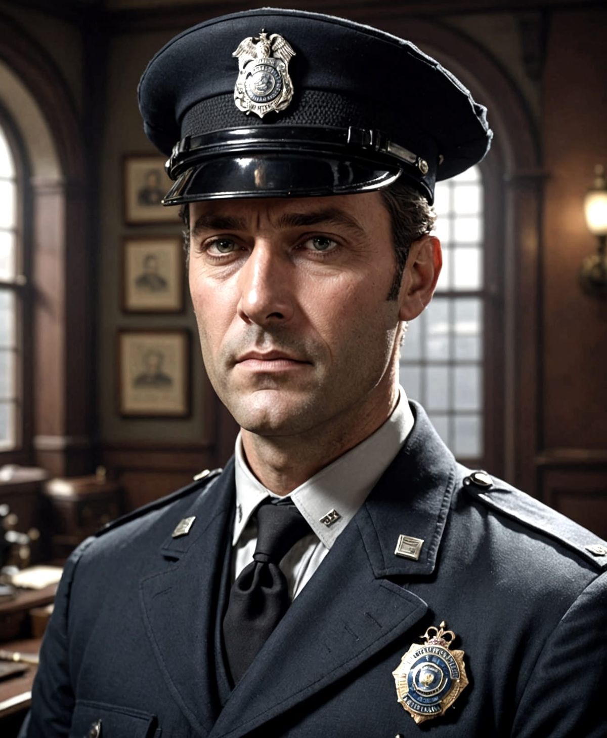 A somber, highly detailed 3D portrait of a middle-aged police inspector in a Victorian-era police station, exuding intelligence and experience, set against a dimly lit, moody background