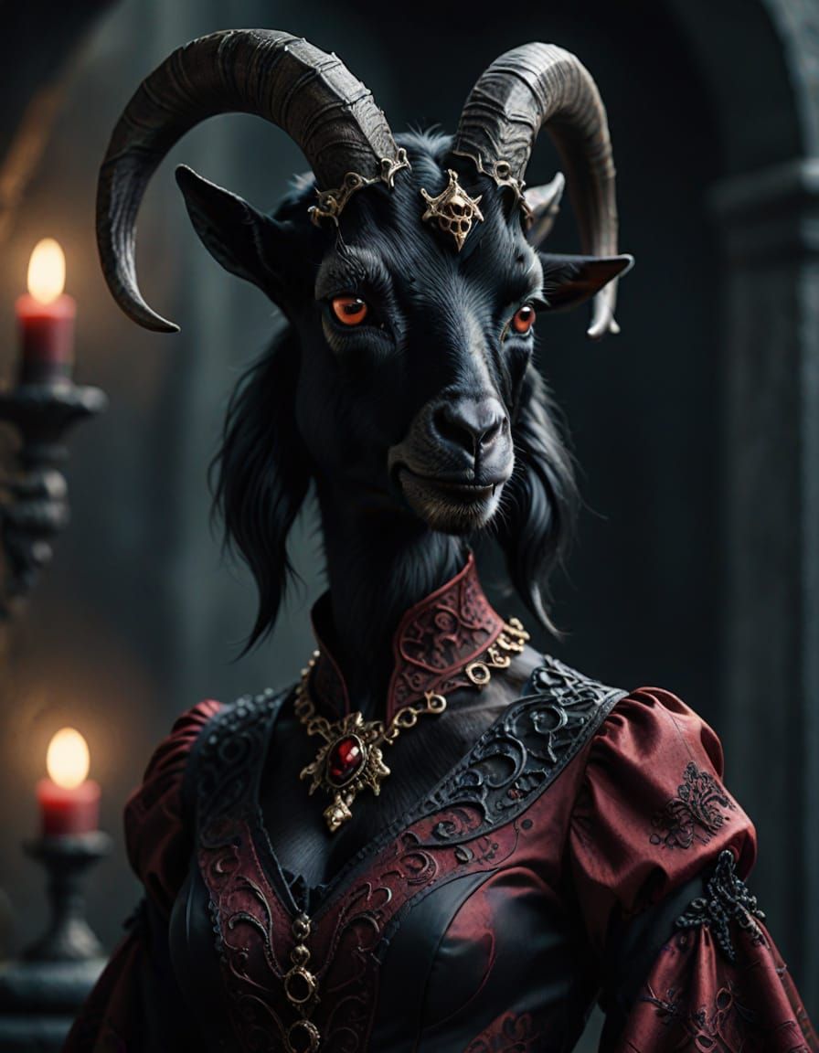 This image shows an anthropomorphic black goat woman in a dark red gothic dress, wearing a skull ring. A close-up shot with a cinematic feel, showcasing high detail and dark fantasy elements.