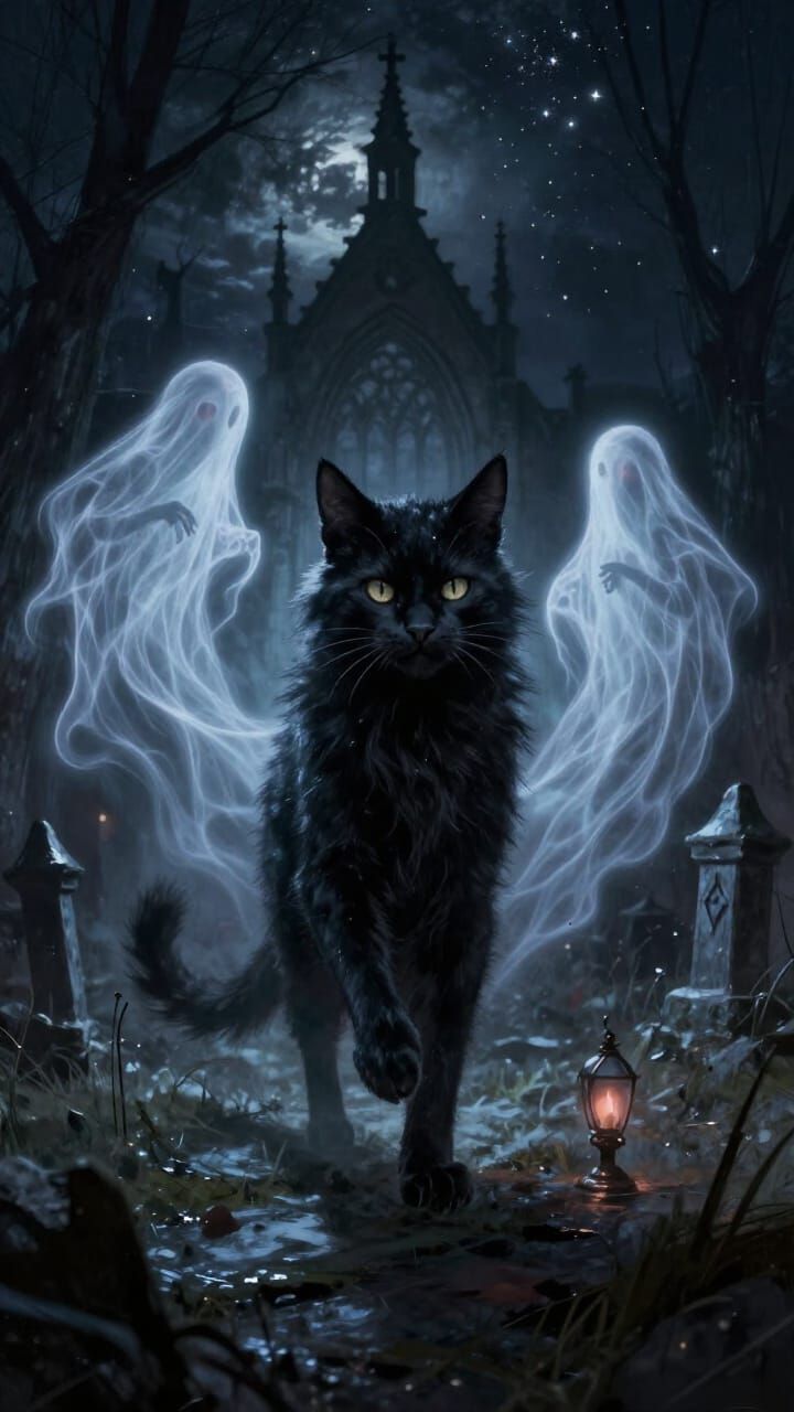 A dark fantasy artwork depicting a Yule cat in a haunted churchyard at night. Ethereal fairy ghosts glow around the cat, creating a spectral and moody atmosphere with dramatic lighting.