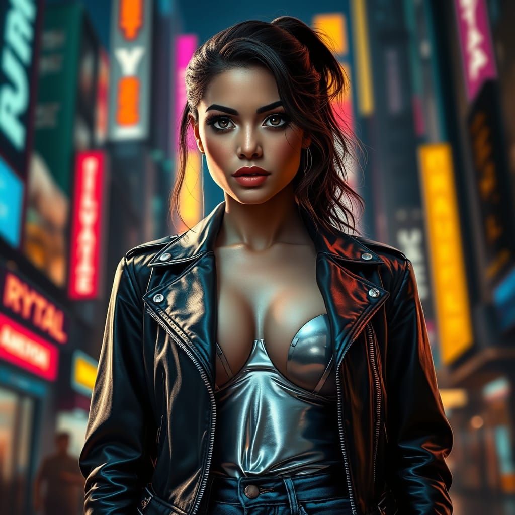 A hyperrealistic image of a cyborg in a futuristic city. The cyborg, with a metallic body and leather jacket, stands under neon lights with a determined expression, in a photorealistic style.