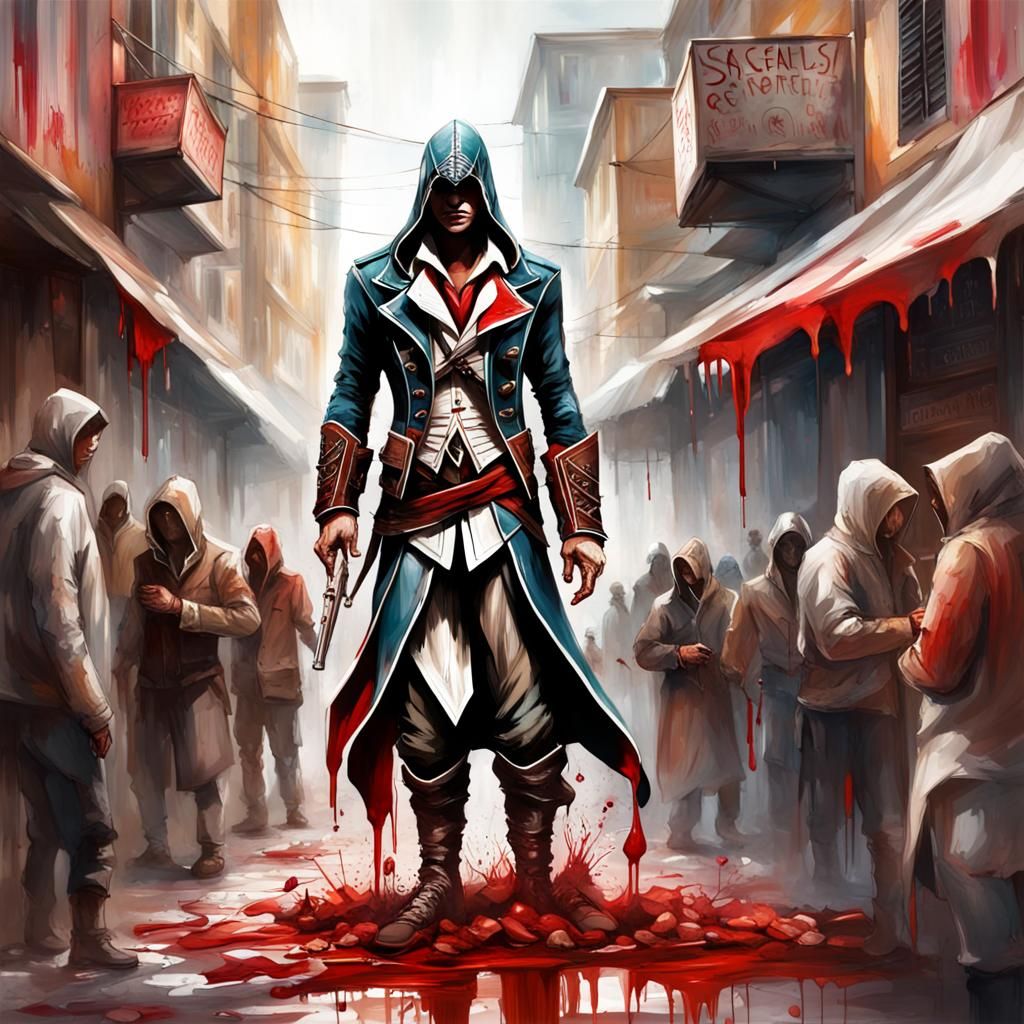 This image depicts a scene inspired by Assassin's Creed, set in a bustling marketplace with graffiti and blood in the background. The artwork is rendered in a vibrant, high-contrast street art style.