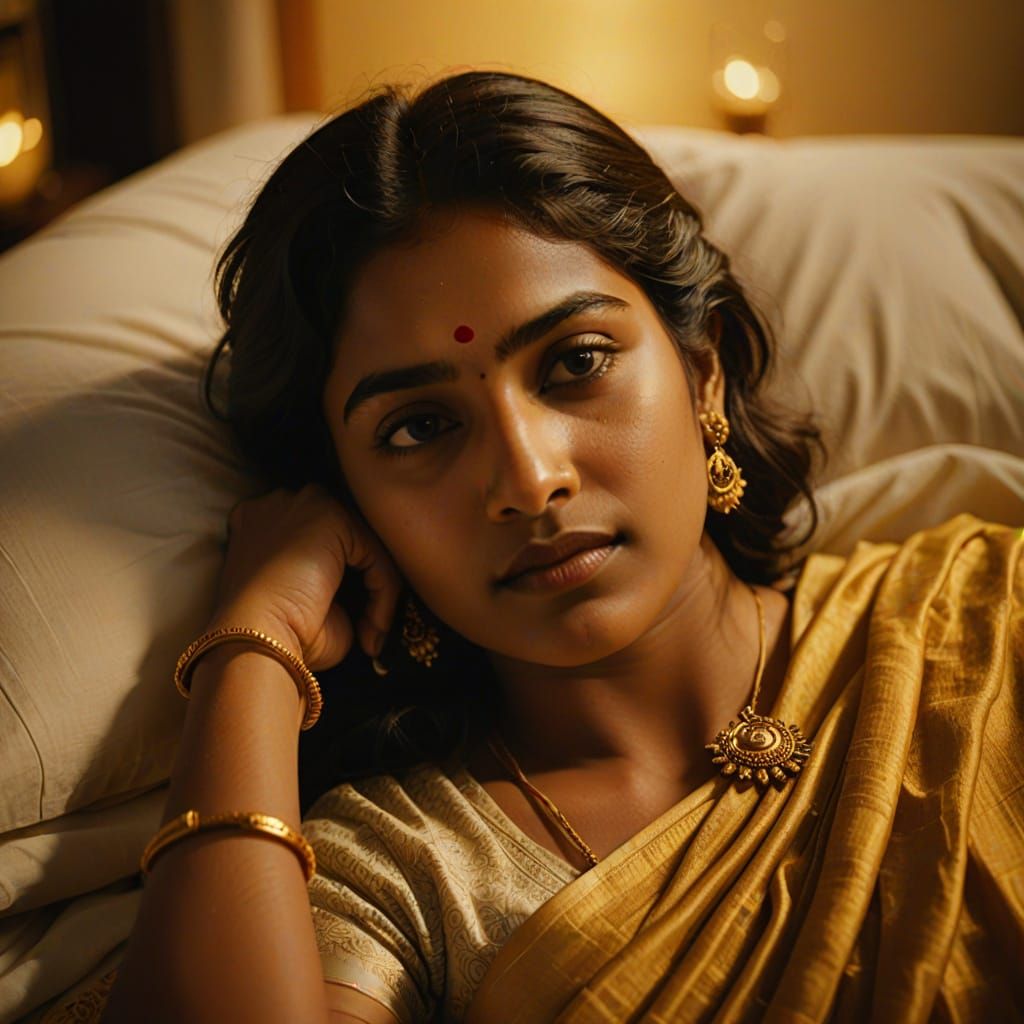 This image shows a Tamil woman in a yellow silk saree lying in bed. The cinematic shot features warm golden lighting, soft glow, and milky skin tones, reminiscent of golden hour.