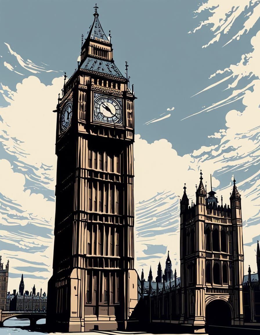 This image is a woodcut representation of Big Ben, a prominent London landmark, captured in a traditional woodcut style.