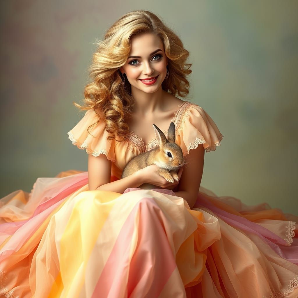 A serene image of a blonde woman with curly hair and a warm smile, cradling a tiny rabbit in her arms, dressed in a flowing pastel gown with delicate lace and a subtle sheen, evoking the dreamy quality of a watercolor painting in the style of Art Nouveau.