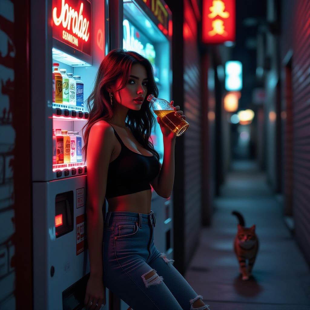This image shows a woman in an alley, illuminated by a vintage soda machine's glow. She wears a crop top and ripped jeans, complemented by glossy pantyhose, in a hyperrealistic, futuristic aesthetic.