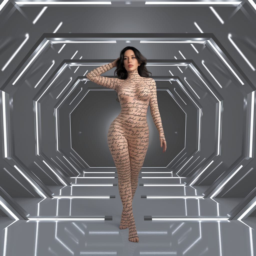 This image shows a woman with calligraphy and tattoos posing as a living artwork. She stands in the center of an abstract, glossy white hall.