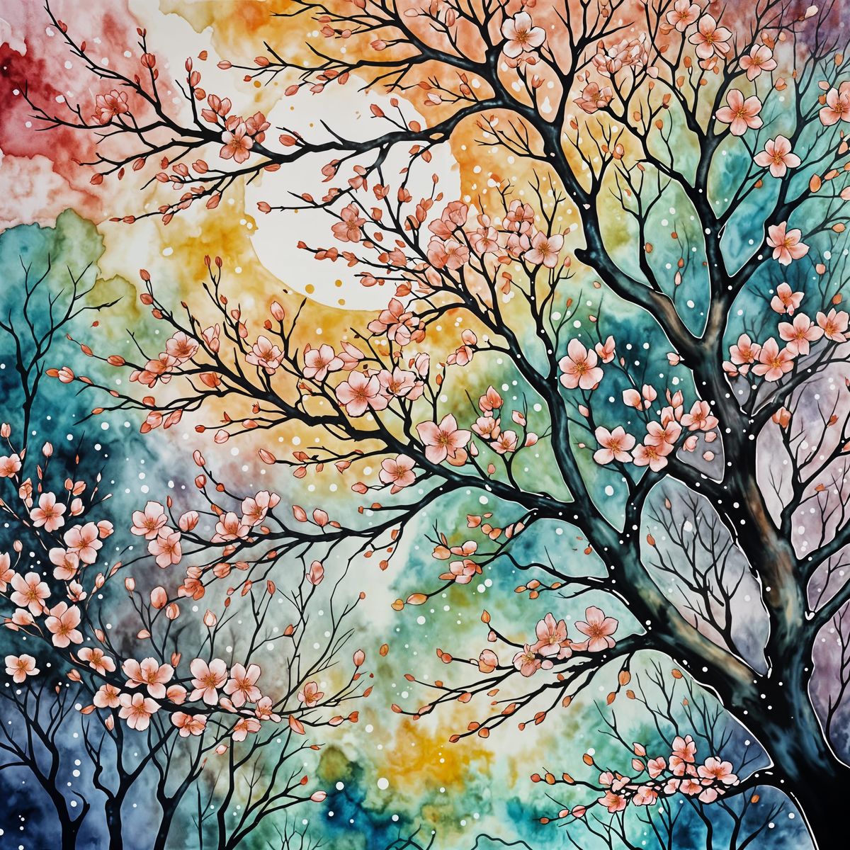 A striking picture of a garden filled with cherry blossoms in full bloom, shortly after sunrise. This watercolor and alcohol ink painting captures the peaceful beauty of nature in soft, organic hues.