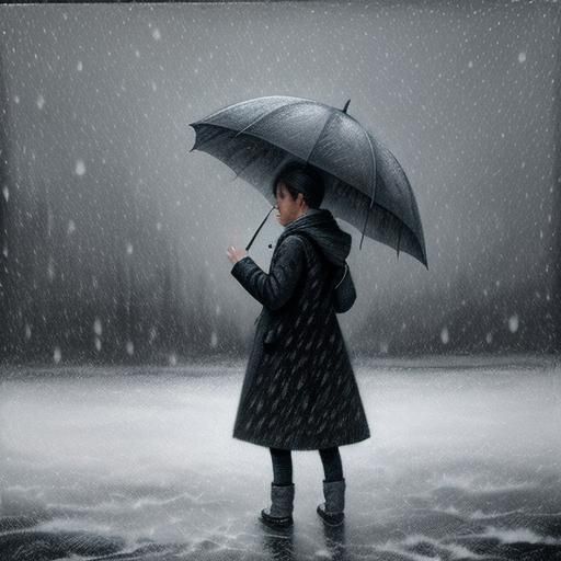 This image shows a weather phenomenon with mixed precipitation. The charcoal drawing style emphasizes the dramatic contrast between light and shadow in the atmospheric conditions.
