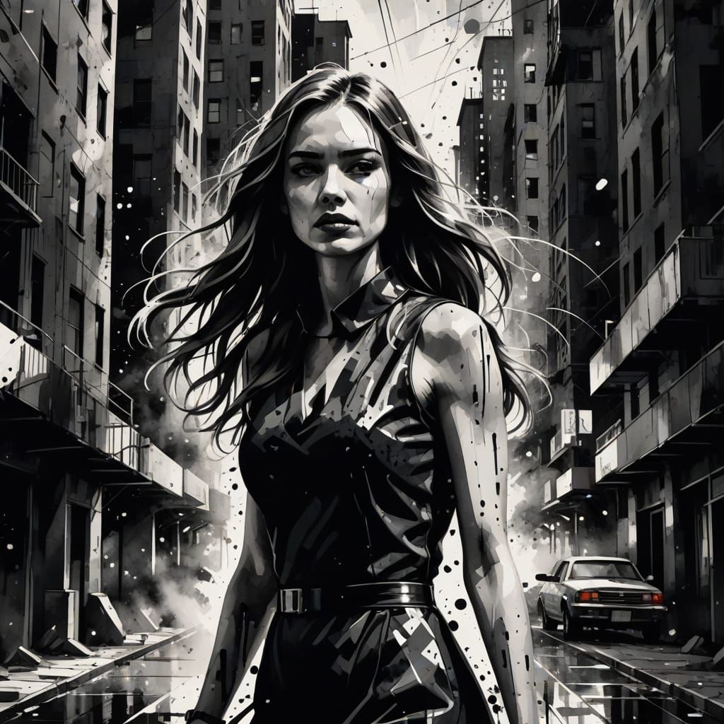A striking picture of a young woman in the style of film noir. High contrast and deep shadows create a moody atmosphere, with dynamic ink splashes and geometric shapes suggesting an urban cityscape.