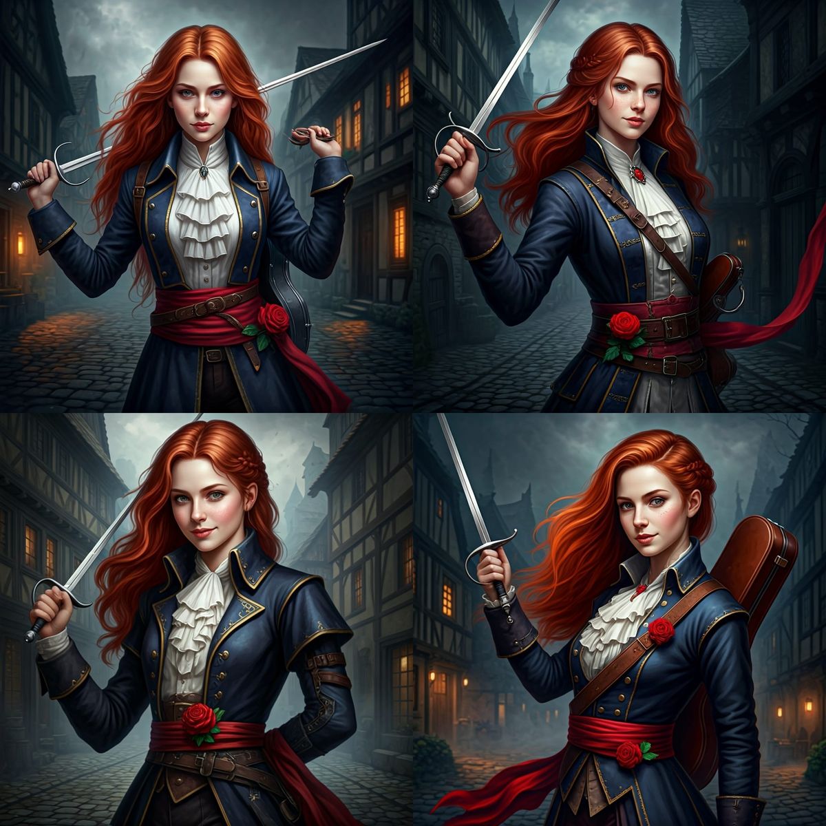 This image shows a beautiful young French duelist in a dark fantasy setting. The portrait captures her striking features and confident pose in high detail with dramatic lighting.