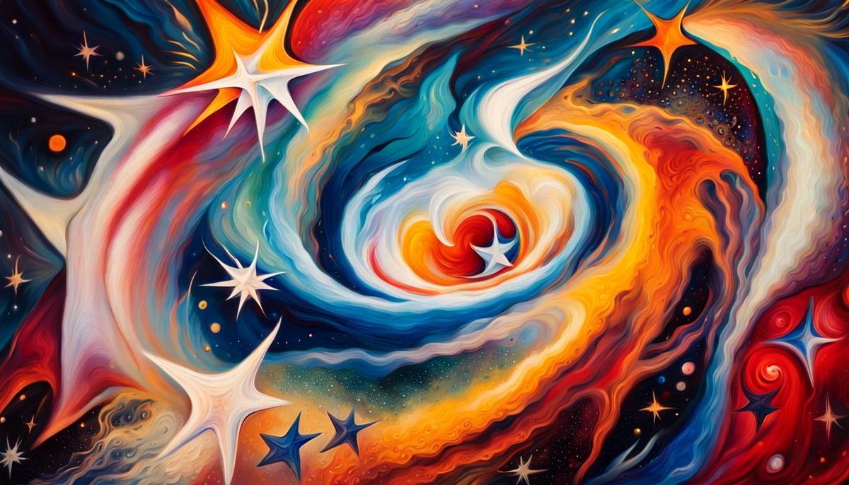 Extreme macro closeups of a family of whirly wavy-pointy stars, surrounded by a swirling whirlpool of cosmic energy and smaller whirly wavy-pointy stars. Abstract expressionism. Chagall, Miro, Kandinsky. Dynamic brushstrokes. Non-linear shimmmering opalescent colors. White. Vibrant, luminous. Intense ...