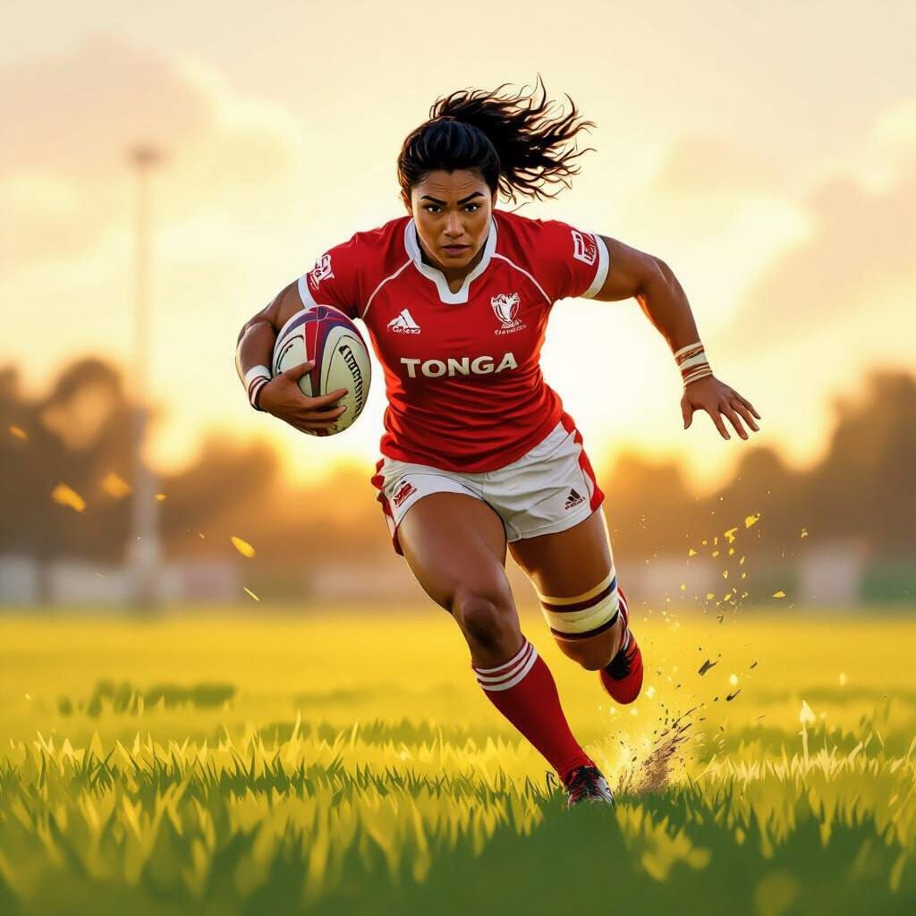 A strong female rugby player in a Tonga kit runs with the ball, scoring a try. The scene is lit by warm golden hour light, captured in a dynamic digital painting style.