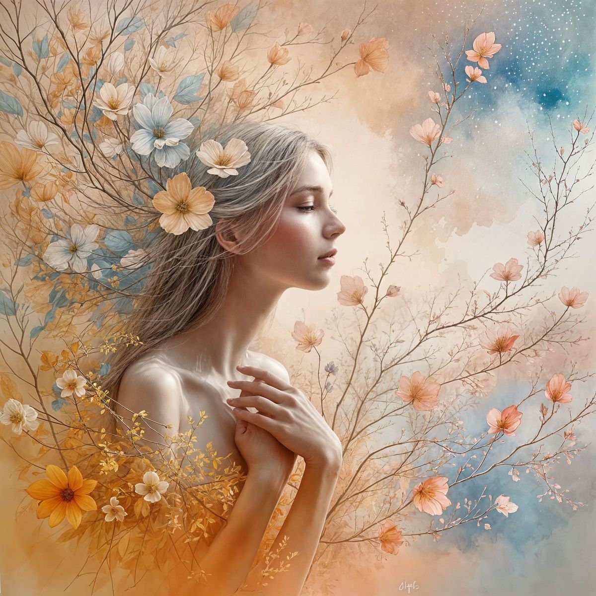 This serene image features a woman surrounded by blooming branches in a soft blue sky, creating a sense of peaceful beauty