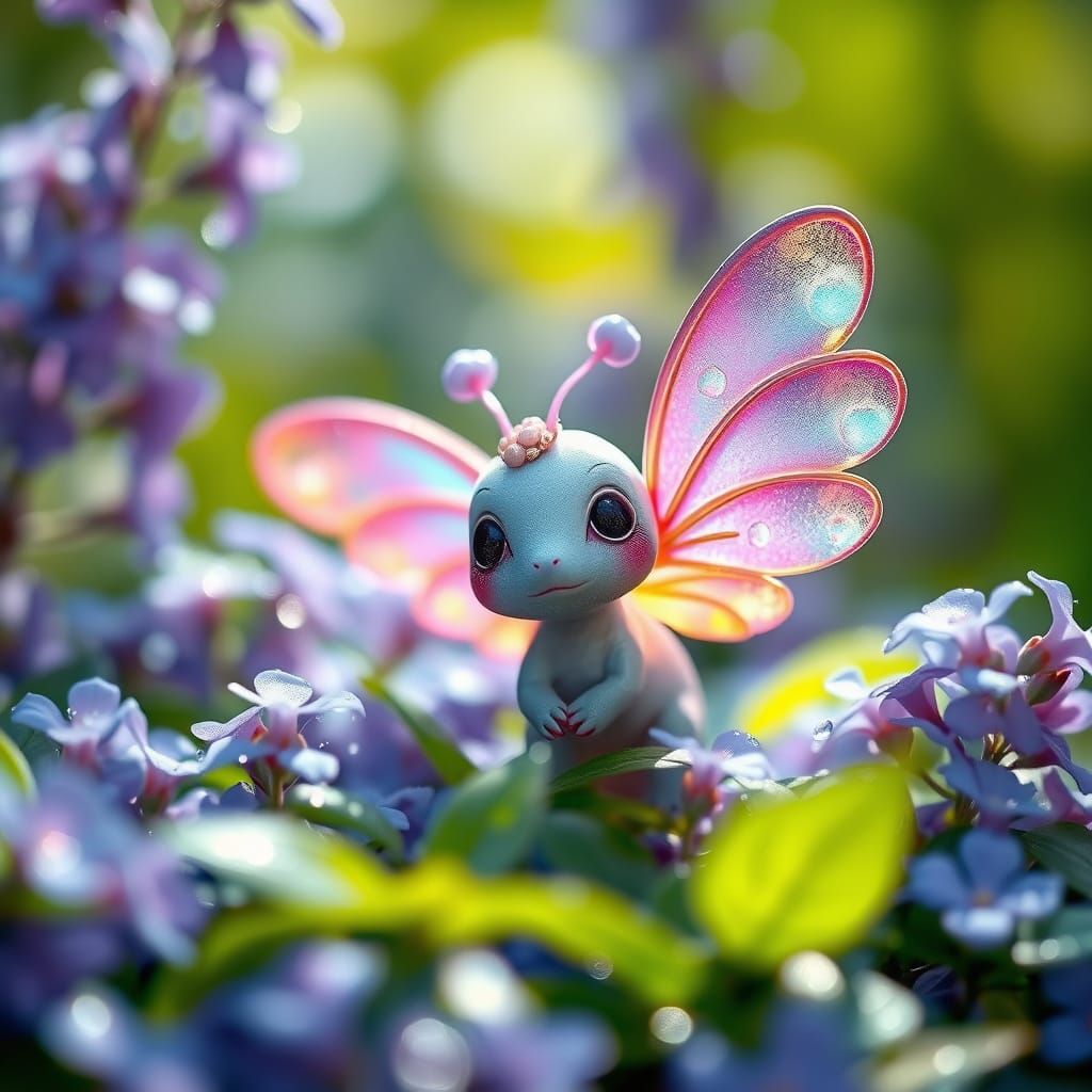 A digital render of a winged creature among vibrant flowers in a magical forest. Dewdrops glisten on the flora, with a soft bokeh effect and macro details, all illuminated by gentle sunlight.