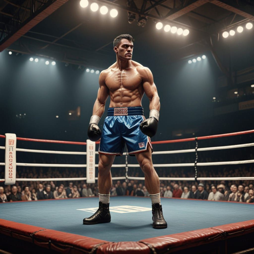 This image depicts a boxer in a boxing ring. The scene has a retro aesthetic, rendered with ultra-realistic and highly detailed textures, lighting, and composition.
