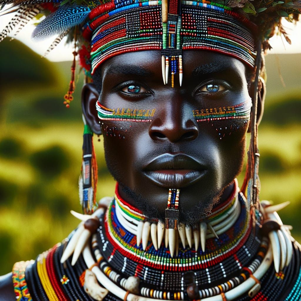 This striking portrait showcases a proud Black tribal man adorned in vibrant traditional attire with intricate beadwork and striking tribal markings. Set against a lush savannah backdrop, his confident gaze reflects the strength and heritage of his culture.