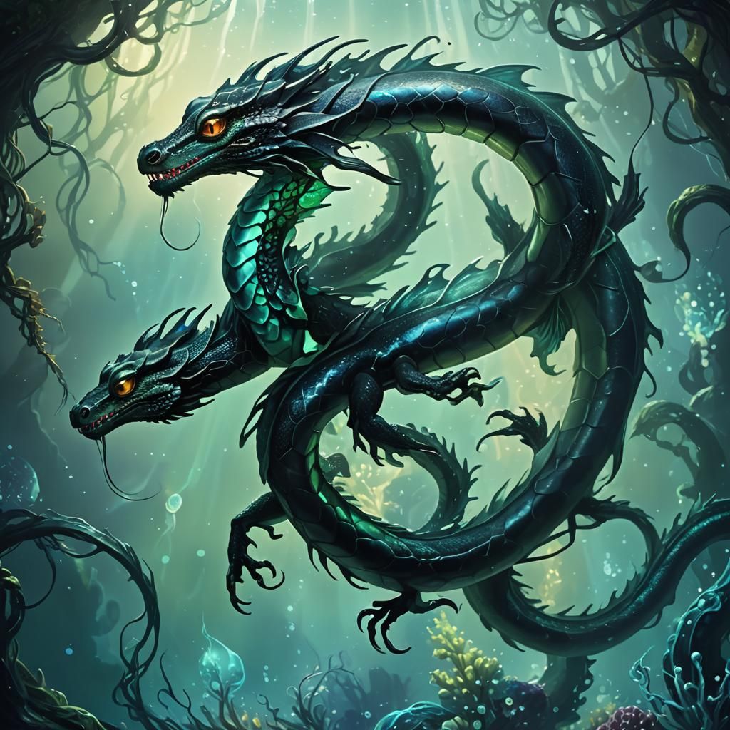 A striking picture of a black, serpentine water dragon swimming in a bioluminescent ocean. The dragon features iridescent scales and intricate patterns, illuminated by ethereal light in a fantasy style.