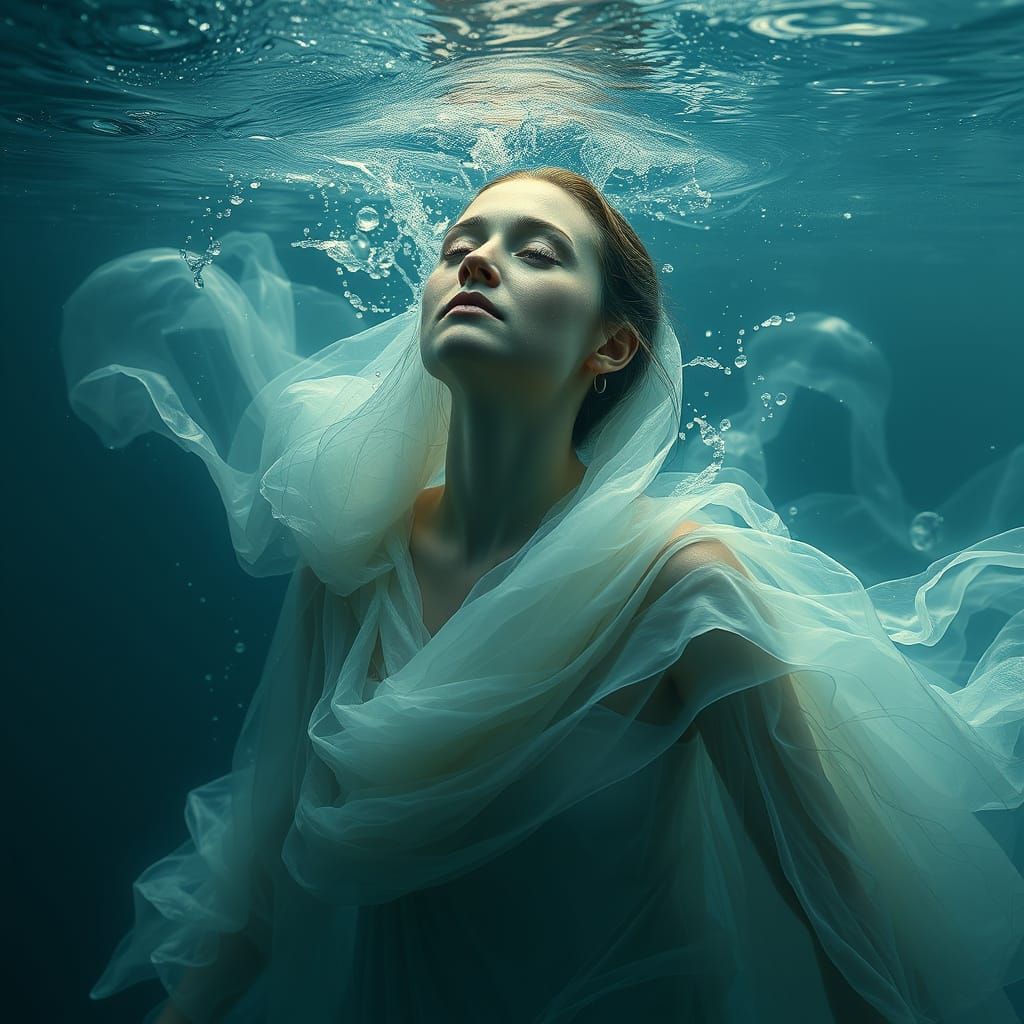 A stunning image of a woman composed of water, featuring flowing robes and delicate features. The hyper-realistic artwork showcases intricate droplets and ripples with meticulous textures and atmospheric lighting.