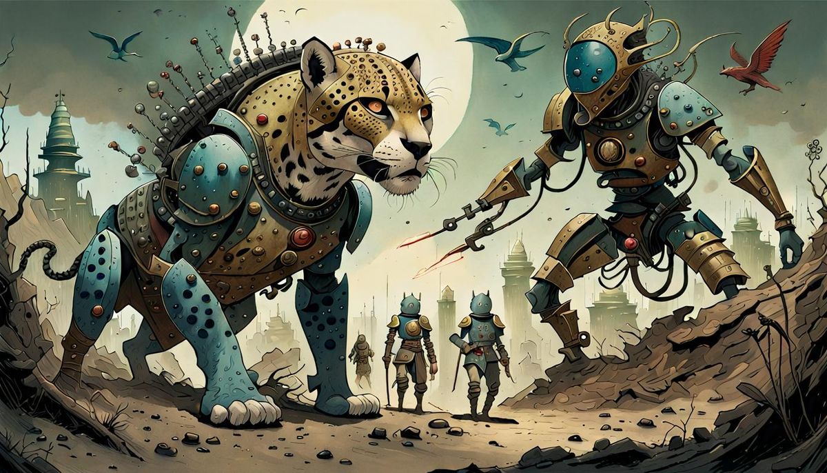 A striking picture of anthropomorphic jaguar knights in sci-fi combat. The image shows a post-apocalyptic landscape with complementary colors, rendered in a retro science fiction style.