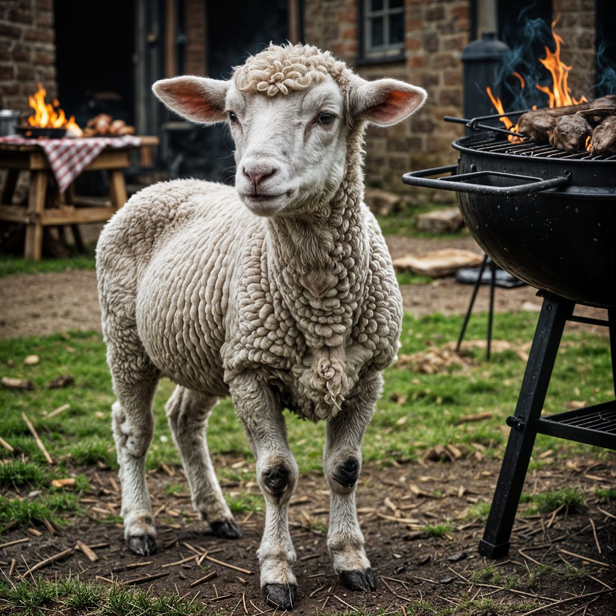 This hyperrealistic image shows a nervous lamb standing next to a barbecue. The shot features intricate details, sharp focus, high contrast, and atmospheric, moody lighting.