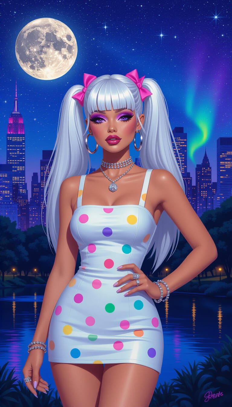 A vibrant 3D illustration of a beautiful woman with stark white hair under a starry night sky in Central Park. The artwork blends cartoon fantasy with neo-psychedelic and Gothic punk elements, featuring colorful neon city lights and the NYC skyline.