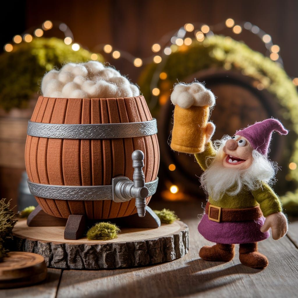 A charming image of a felted beer keg and mug set in a cozy tavern. A jovial dwarf raises a glass in toast, all rendered with a handcrafted, stop-motion animation aesthetic.
