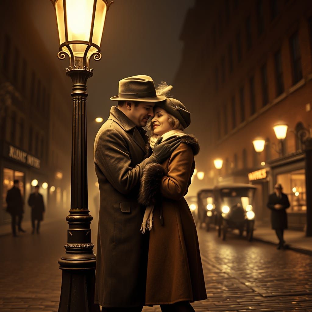 This image shows a couple embracing under a streetlight in a vintage early 20th-century photograph. The scene captures the quiet atmosphere of the city with soft lighting and period details.