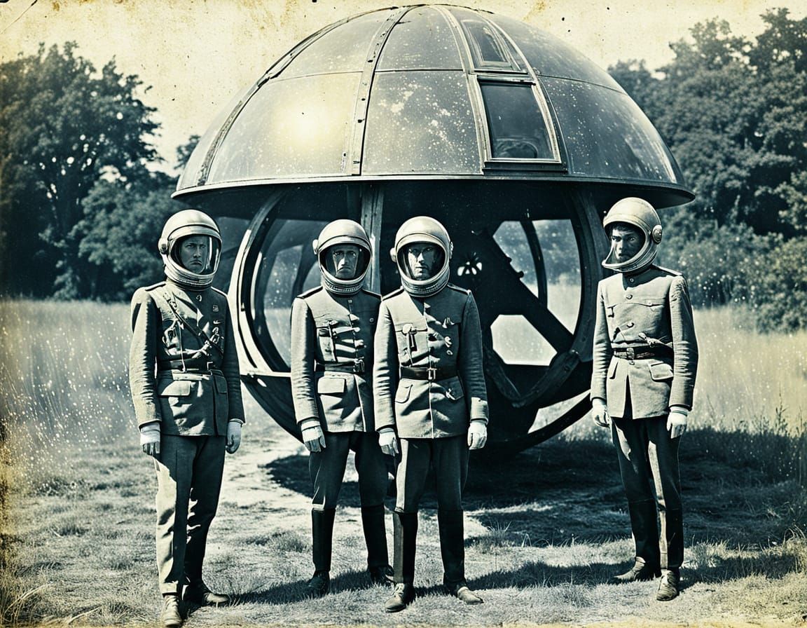 This image is a nostalgic blend of science fiction and surrealism, reminiscent of old antique photographs. A unique fusion of retro and futuristic elements.