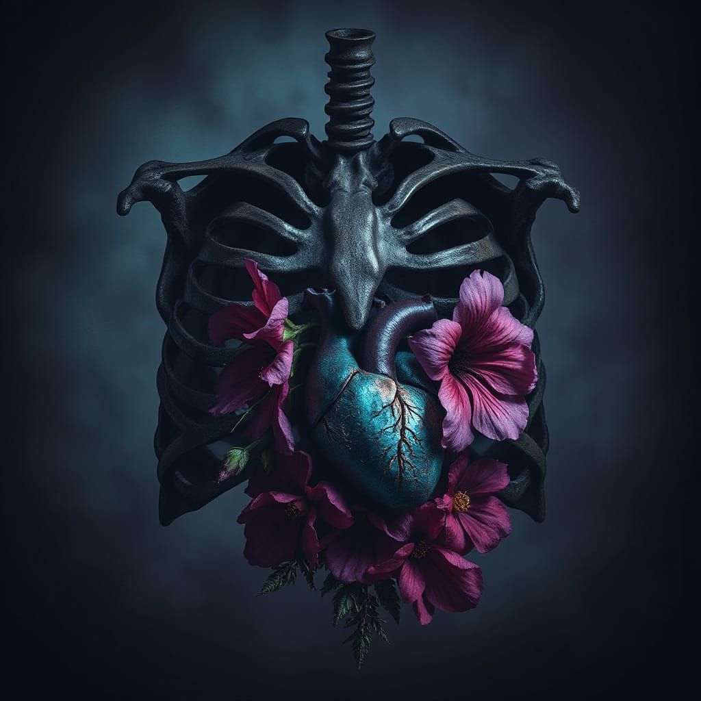 This image showcases dark romantic digital art with vibrant florals emerging from anatomical elements like rib cages or hearts. Rendered in deep purples and teals with dramatic lighting, it evokes elegant decay and rebirth.