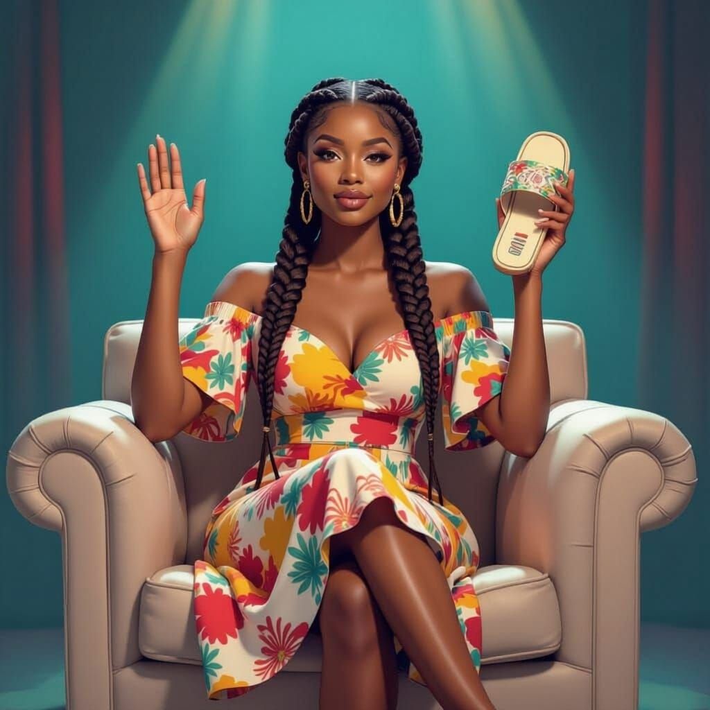 This image features an African woman with beautiful braids and a vibrant dress, seated on a talk show set. She is raising her hand, holding oversized, cracked slippers.