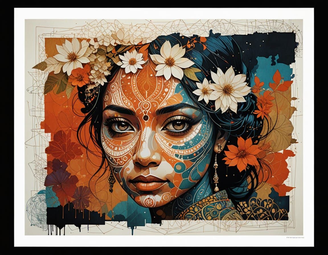 By Paul Lovering and Mattias Adolfsson and Russ Mills and Victo Ngai and Alexander Jansson:: Double exposure, dual exposure different weaves of Bengal Kantha ,batik!! Front view :: The beautiful galaxy dripping into a world of dyes and block print of batik and batikwork+ SILHOUETTE of a weavers head!! ...