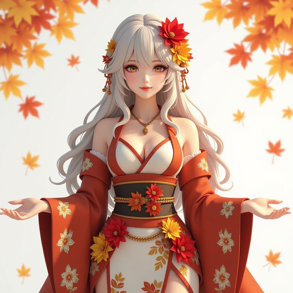 This image showcases a full body, hyperrealistic depiction of a beautiful, whimsical woman adorned in an intricate outfit made of autumn flowers. Rendered in a detailed 3D anime art style with photorealistic textures.