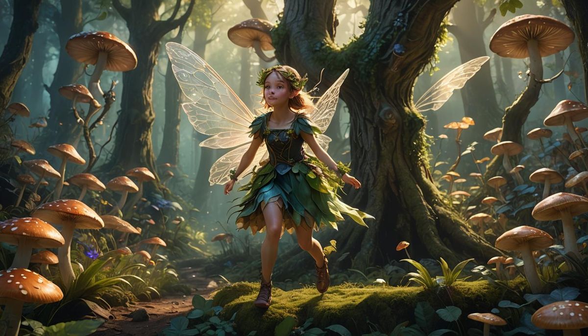 This image shows a whimsical fairy frolicking in an enchanted forest. The scene is rendered as a detailed matte painting with soft, glowing mushrooms and cinematic lighting, in a magical realism style.