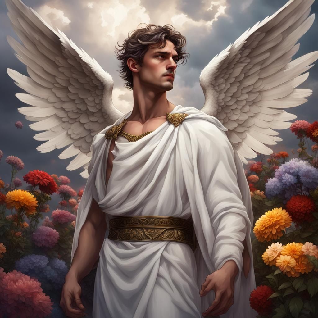 A dramatic depiction of a beautiful angel falling from the sky. The portrait features a young man with broken wings amidst dark clouds and a vibrant flower garden, rendered with dynamic lighting and intricate details.