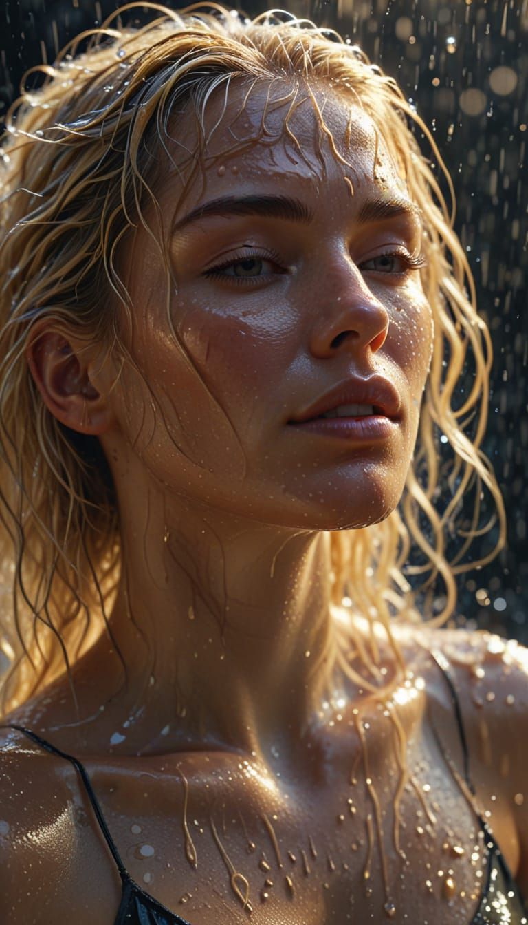 This hyperdetailed digital painting captures a woman with wet, untidy blonde hair. Delicate strands cling to her skin, with shimmering water droplets highlighted by dramatic, diffused backlighting.