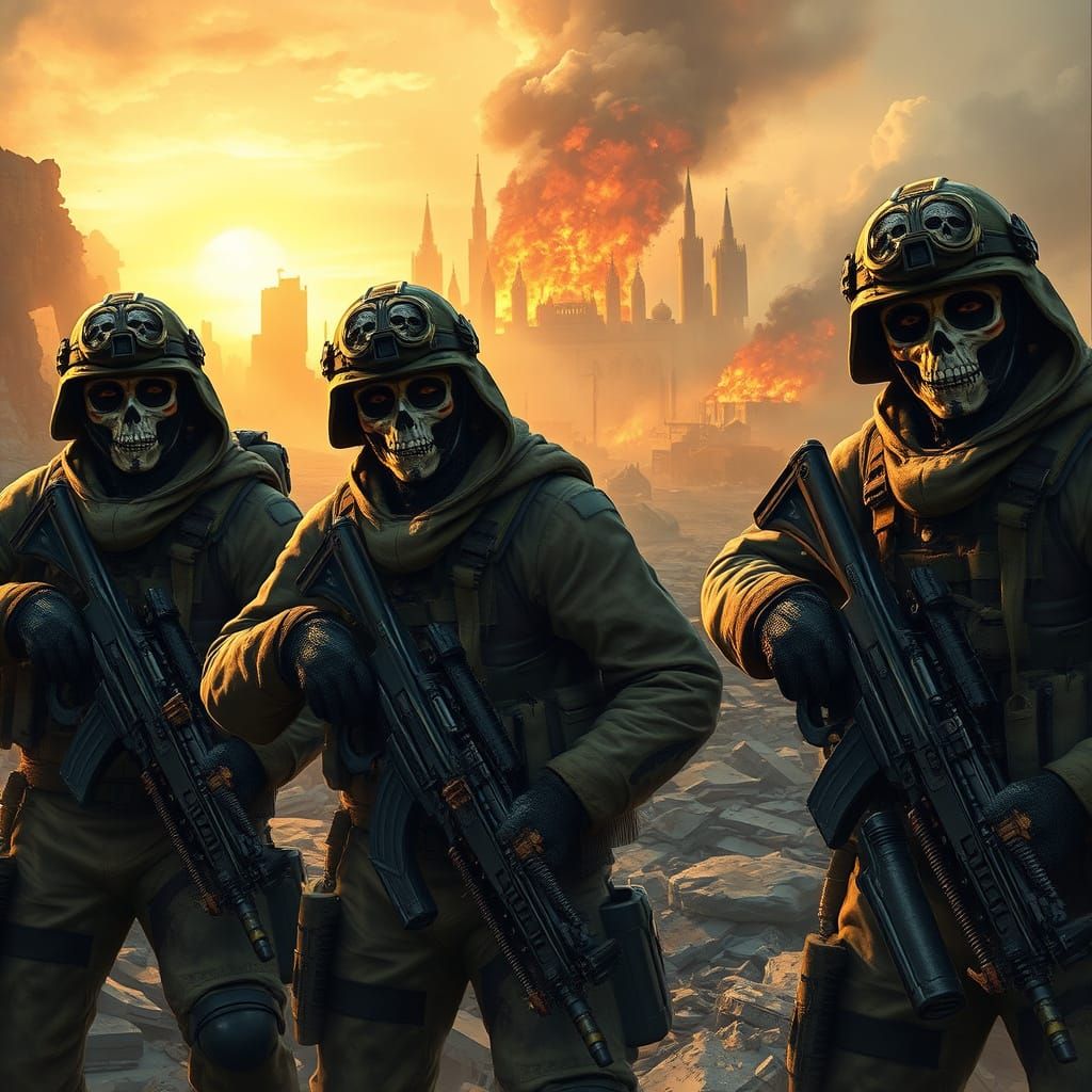 This image depicts a group of battle-hardened elite operators standing resolute amidst a desolate wasteland, armed with a mix of military-grade and improvised weaponry, as a massive city burns in the background, casting a warm, golden glow.