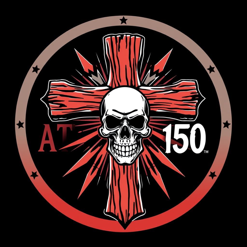 A striking emblem logo with a distressed wooden cross and skull. This design blends old-school tattoo art with punk rock aesthetics and bold animated lines in a military-inspired style.