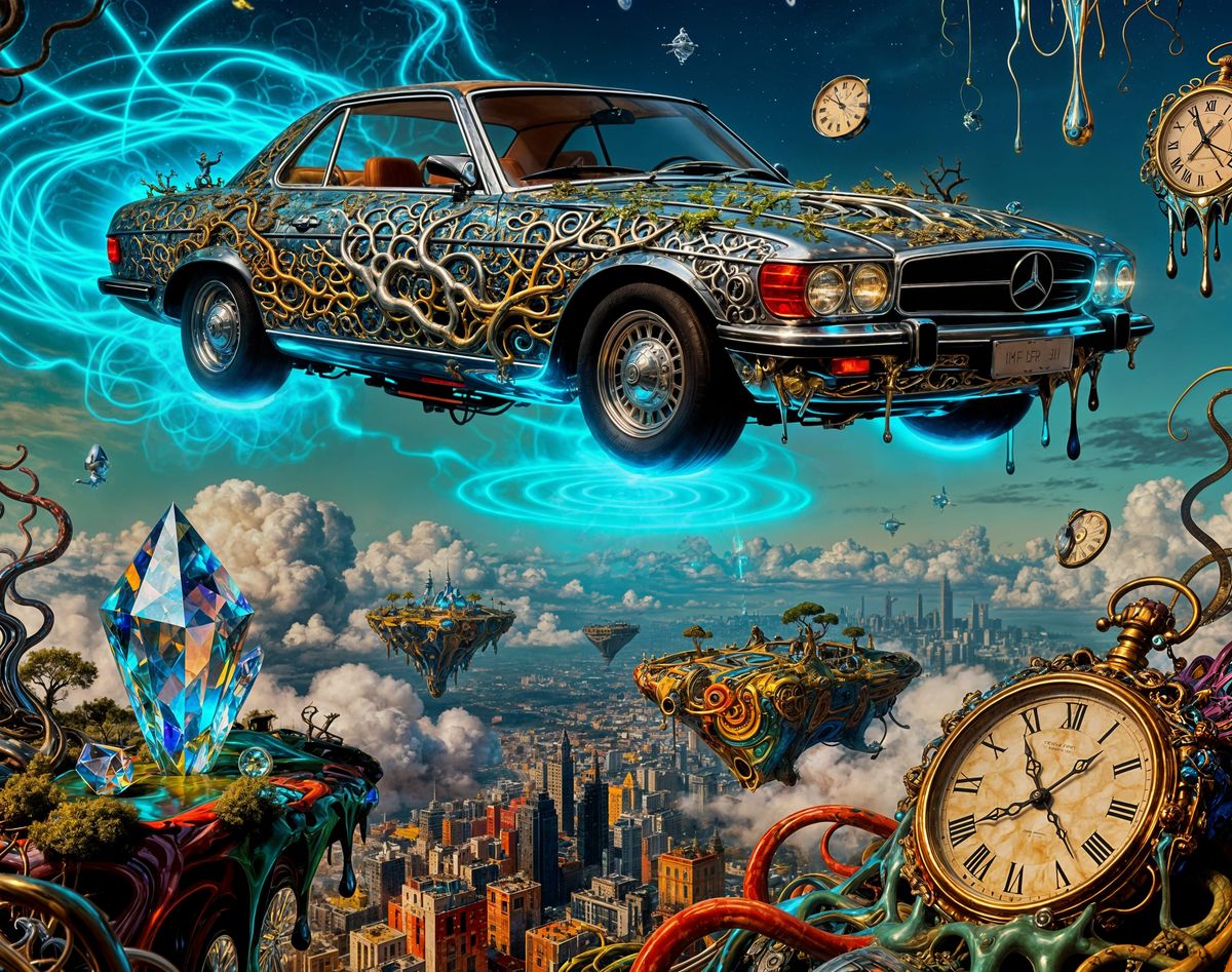 This image depicts a surreal scene of a flying car being teleported to a new owner, rendered with intricate details and bright, deep colors in a magical realism style.