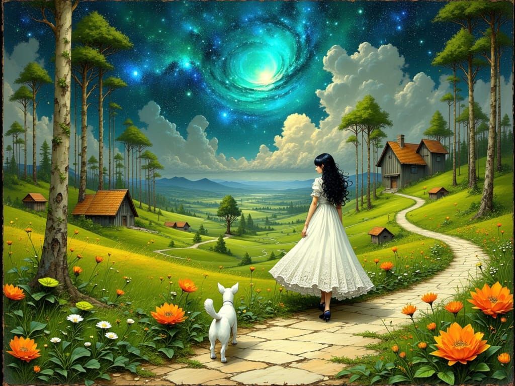 This image shows a woman in a white dress walking her dog on a flower-lined path. Charming houses and trees dot a vibrant, photorealistic fantasy landscape under a starry sky, in a whimsical style.