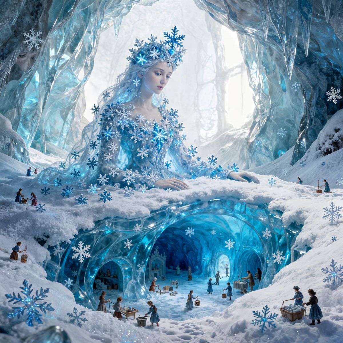 This image depicts a shimmering Snowflake Queen formed from intricate icy blue snowflakes. She resides in a surreal cavern home beneath the snow, illuminated by ethereal white light.